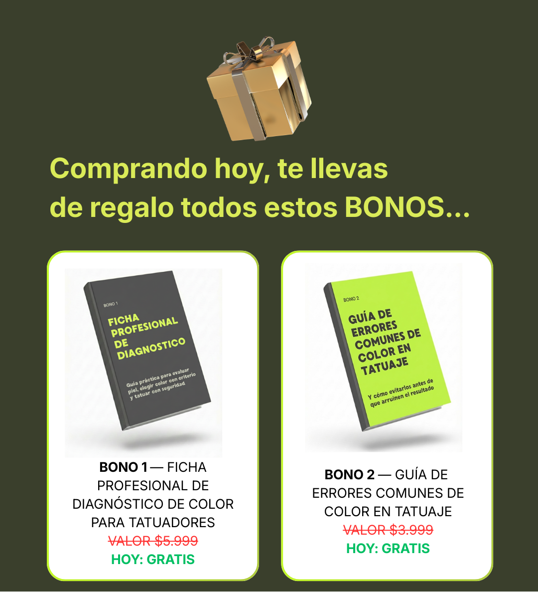 “Hace años que tatúo color y aun así encontré muchísima información útil. El material es completo, bien explicado y va directo a problemas reales que tenemos al tatuar piel.”