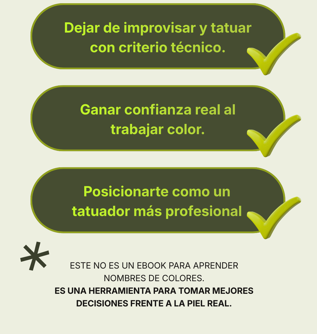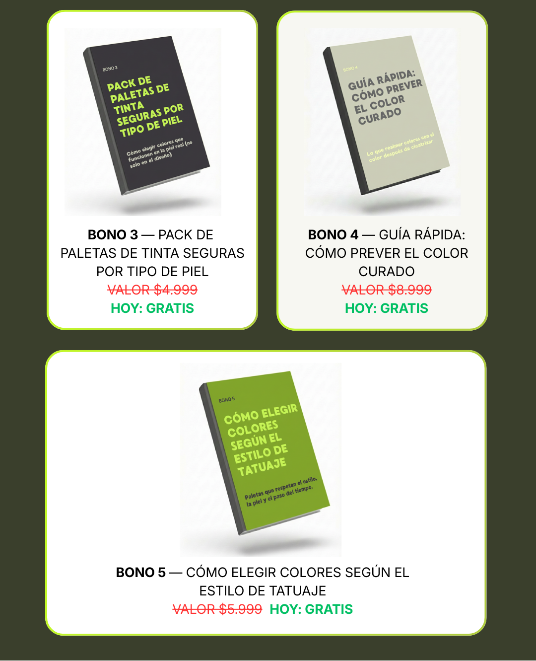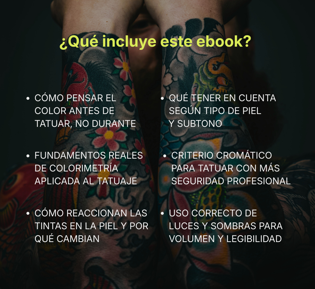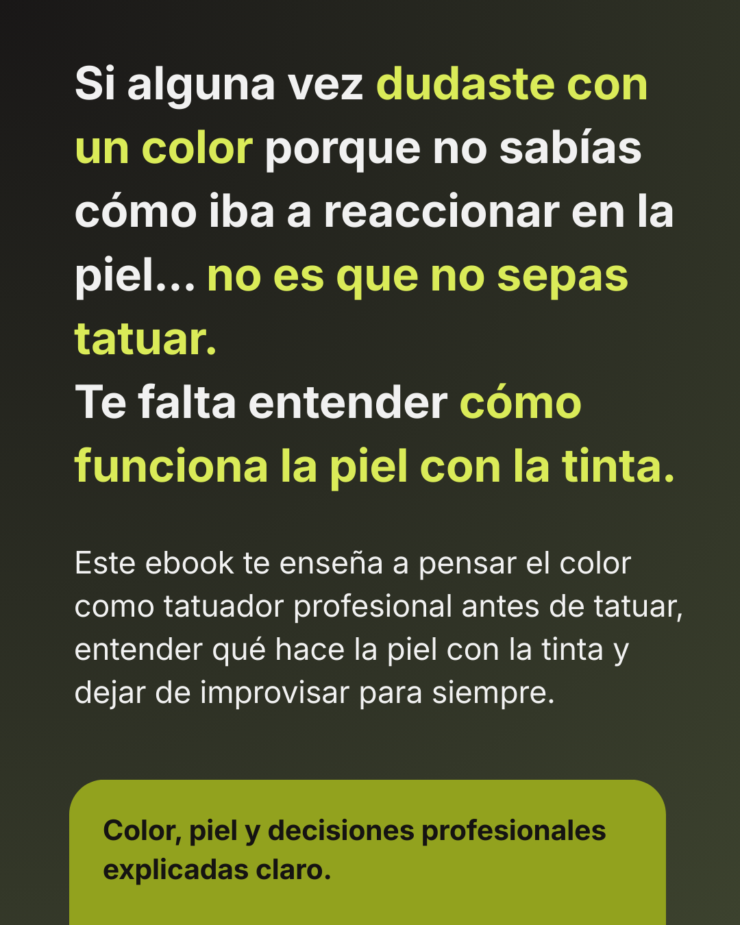 El ebook incluye guías prácticas, ejemplos reales, paletas seguras por tipo de piel, ejercicios mentales para decidir color antes de tatuar. No necesitás años: necesitás mejores decisiones puestas en práctica.