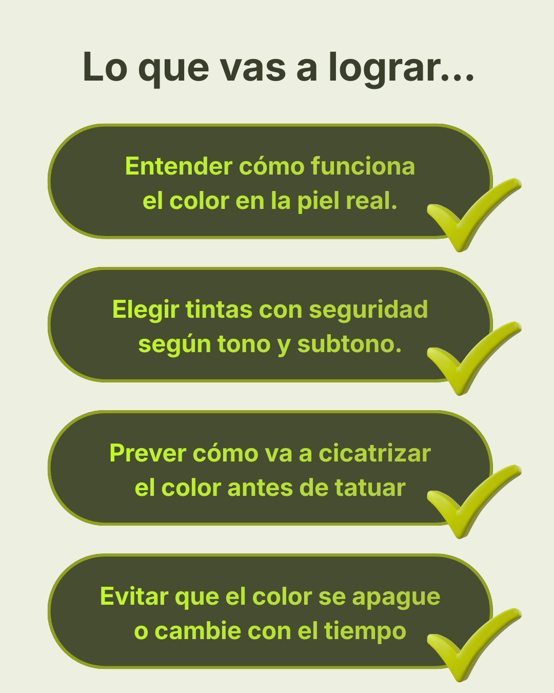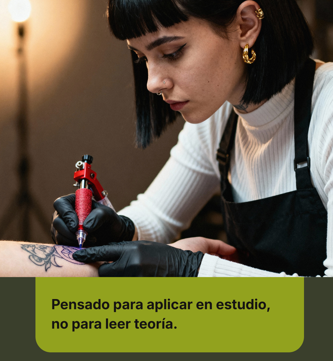 Sí, no importa el nivel que tengas. Está pensado para tatuadores que ya trabajan en piel, pero sienten inseguridad al elegir colores, prever el resultado curado o lograr contraste real. Vas a aprender criterio cromático aplicado al tatuaje.